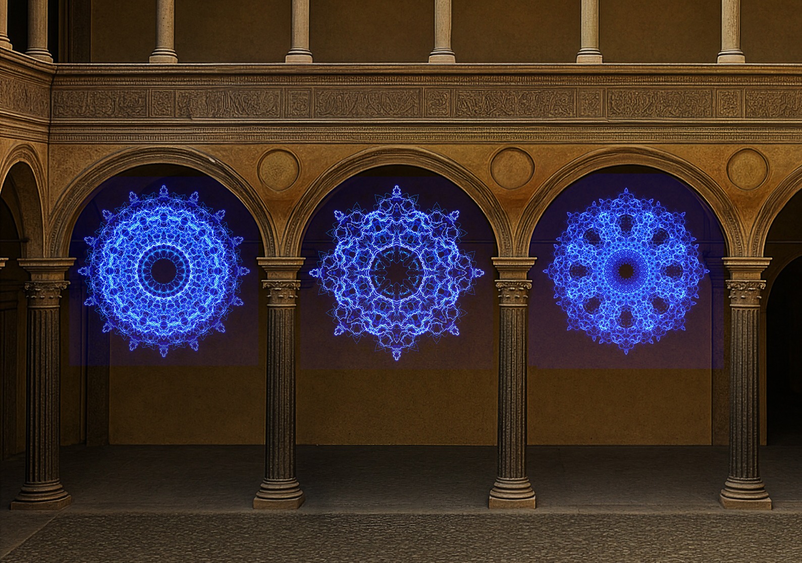 Transies – euntis, un progetto multimediale del Duo ES, composto dagli artisti Nicola Evangelisti e Silvia Serenari, noti per un percorso di ricerca sulla Luce in relazione ai simboli del sacro nelle antiche religioni, in collaborazione con il compositore omonimo Nicola Evangelisti. Il progetto Transies – euntis è incentrato sul concetto di sacralità della Luce nell’arte, e dell’arte come varco spirituale. La corte di Palazzo Bevilacqua Ariosti, antica dimora nobiliare rinascimentale, si farà “iconostasi” tramite la proiezione, sulle pareti interne del Chiostro, di rosoni digitali luminescenti che, come per le icone sacre a suo tempo, assurgono a varco per attivare una dimensione spirituale e trascendente.