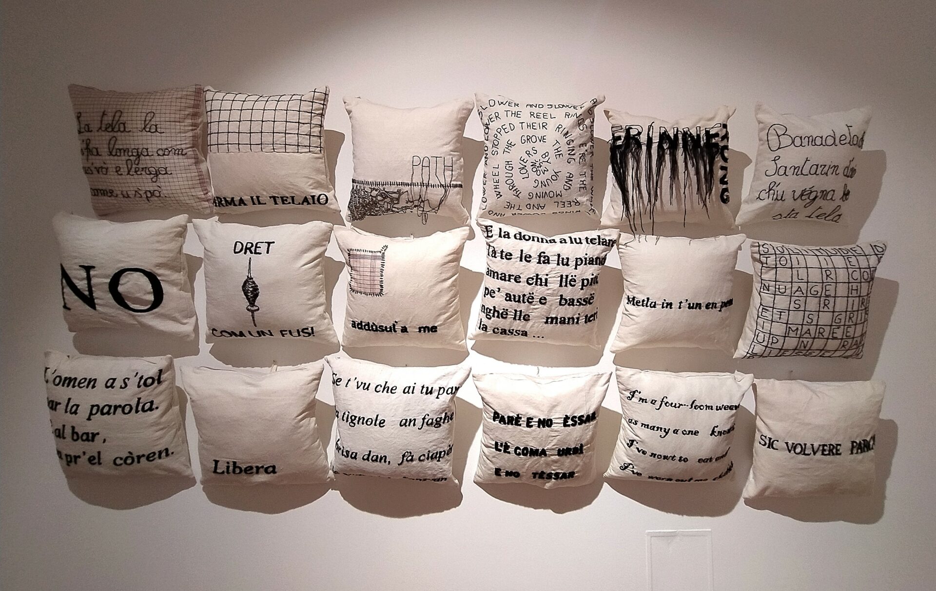 langue maternelle – tisser l’immatériel è un’installazione a parete composta da 36 cuscini di un’antica tela di canapa tessuta a mano ed originaria della pianura bolognese e ricamata con parole e frasi in antiche lingue italiane, francesi e inglesi, luoghi in cui l’artista ha vissuto e dove ha raccolto proverbi, detti, canti e suoni dimenticati che raccontano della memoria del tempo, scandita attraverso il lavoro al telaio. Un lavoro delicato e poetico che riflette sulla trasmissione culturale e sulle forme immateriali dell’appartenenza.