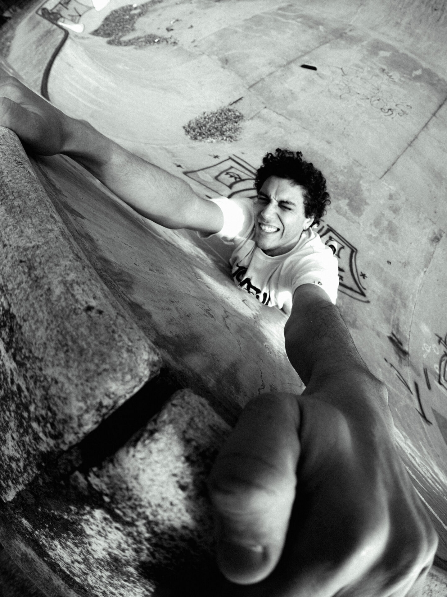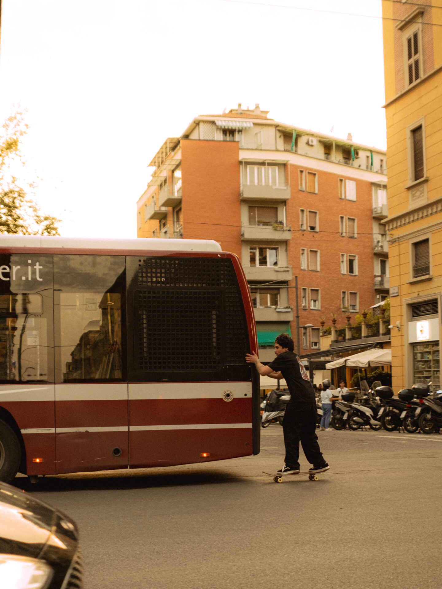 Una delle fotografie ritrae proprio uno skater attaccato al retro di un autobus, “sono cose che gli skater fanno, c’è un’identità, un mettersi in mostra, criticabile ma anche volutamente forte. Gli skater vedono la foto e si ritrovano, le altre persone invece vedono una scena inusuale che li attira.”