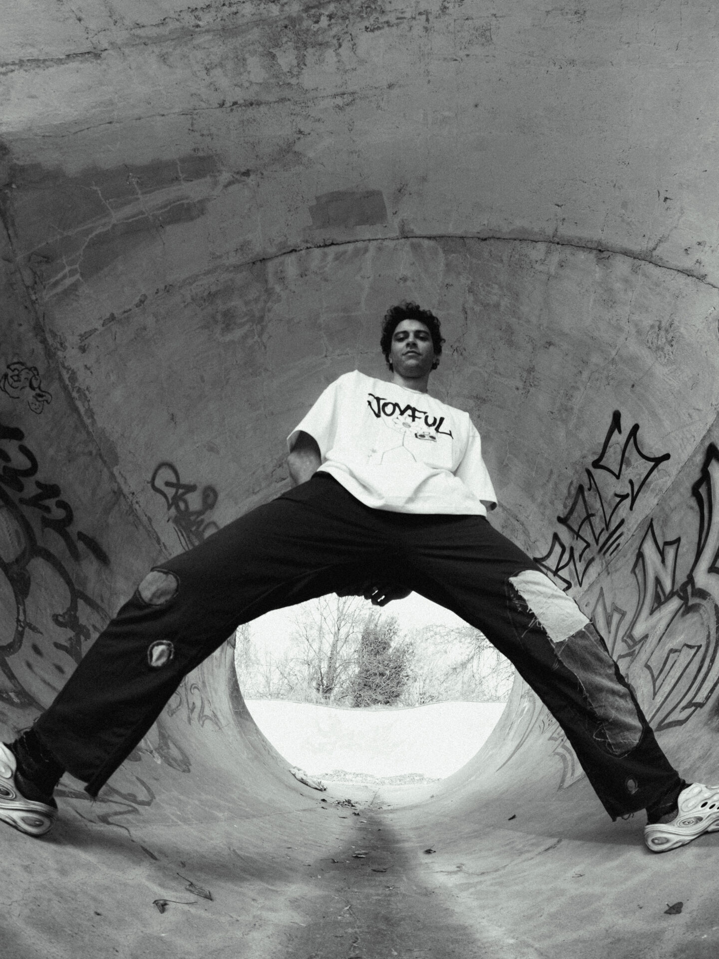 I temi di dualità, contrasto e opposizione sono centrali in questo progetto e nel percorso di Simone, e tornano più volte durante la nostra intervista: “ci piace il contrasto tra queste due parole, Joyful e Riot, sia a livello concettuale, che a livello di immaginario. Abbiamo creato una collezione con approccio street ma con disegni più gioiosi, affiancando allo scenario underground più cupo qualcosa di giocoso, semplice e infantile, anche a livello visivo.” Maglie oversize, skater, ballerini hip-hop, scenari urbani, graffiti e bombolette si mescolano a fiori e all’orsetto Tod.