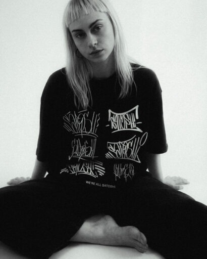 La stampa di una maglietta della collezione ha il riferimento esplicito ‘Bitcoin’, ha i colori in negativo, con il filtro negative il simbolo del Bitcoin diventa del suo colore arancione e l’erba da magenta a verde. Poi ci sono la maglietta e la felpa “We’re all Satoshi”: Satoshi Nakamoto è lo pseudonimo utilizzato dalla persona o dal gruppo di persone che ha inventato i Bitcoin e il primo database basato su blockchain, e la cui identità è tuttora sconosciuta.