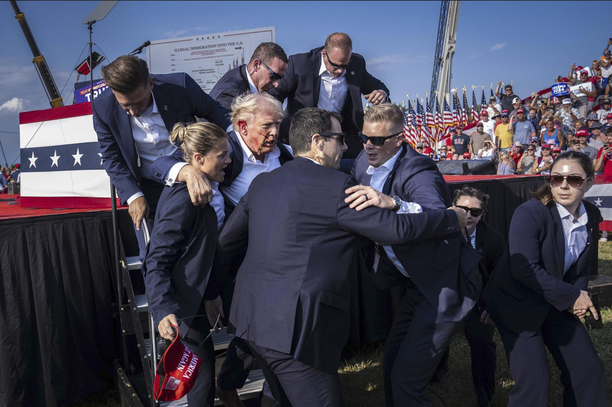 Attempted assassination of Donald Trump, Jabin Botsford. Una delle scene più iconiche del 2024: Donald Trump scende dal palco in Pennsylvania, dopo essere stato colpito all’orecchio dal proiettile di un attentatore.
